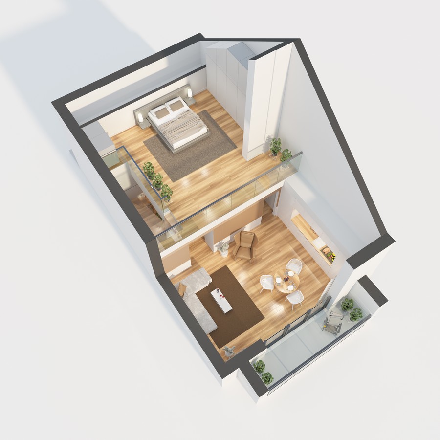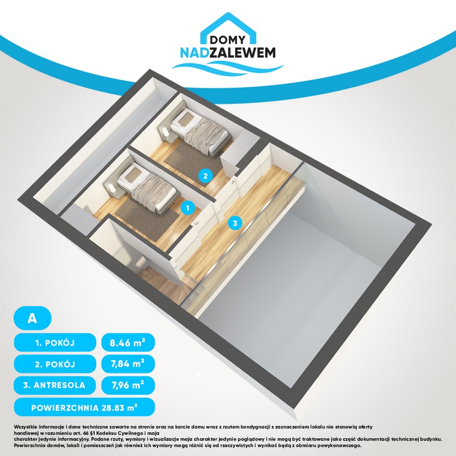 Na drugiej kondygnacji znajduje się przestronna i otwarta antresola z widokiem na salon. W opcji dodatkowej do wyboru jest wersja A z dwoma sypialniami oraz wersja B z sypialnią wraz z oddzielną łazienką.