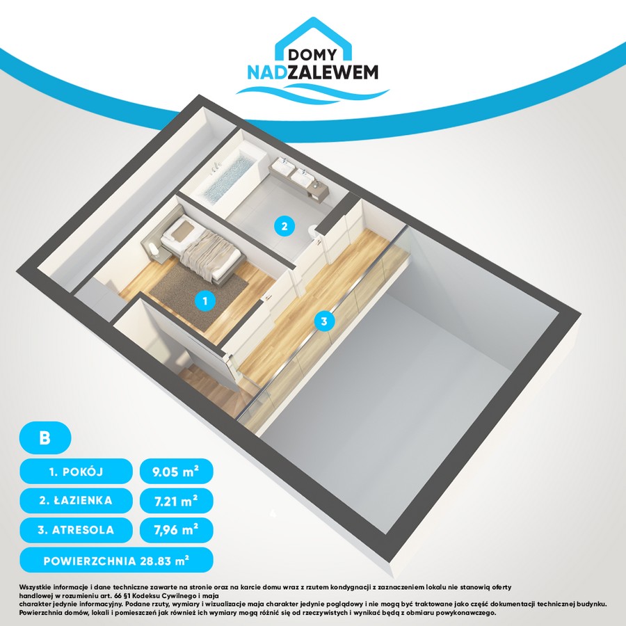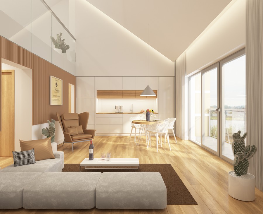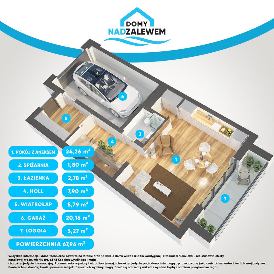 Każdy z domów posiada powierzchnię 150,80 m2 w skład, którego wchodzą trzy kondygnacje. Na parterze znajduje się nowoczesny i przestronny salon z aneksem kuchennym z wysokim sufitem do ponad 5 m i wyjściem na loggię z widokiem na zalew, spiżarnia, łazienka z miejscem na prysznic, hol oraz wiatrołap. W bryle budynku znajduje się również garaż na jedno stanowisko.