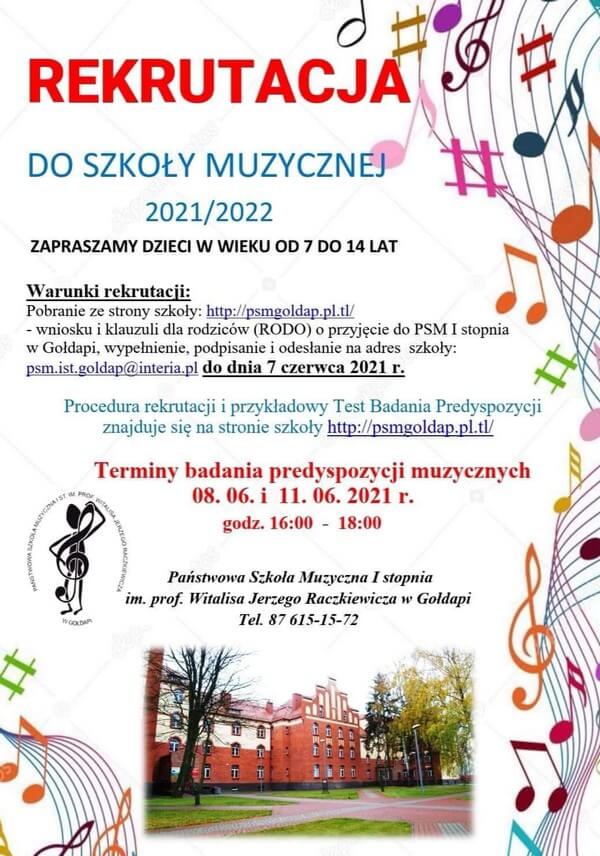 Trwa rekrutacja do Państwowej Szkoły Muzycznej I stopnia im. prof. Witalisa Raczkiewicza w Gołdapi na rok szkolny 2021/2022. Zapraszamy dzieci w wieku od 7 do 14 lat.