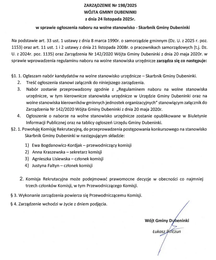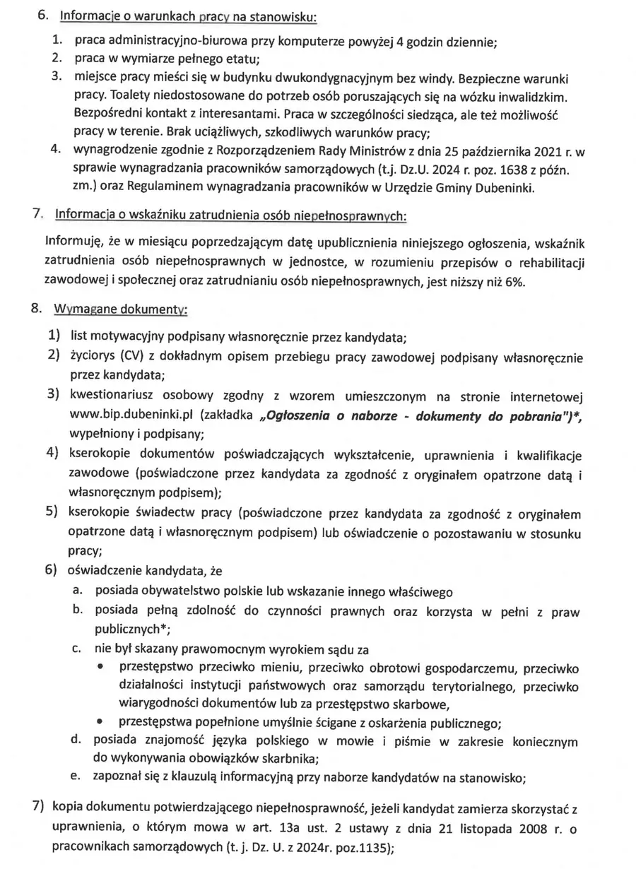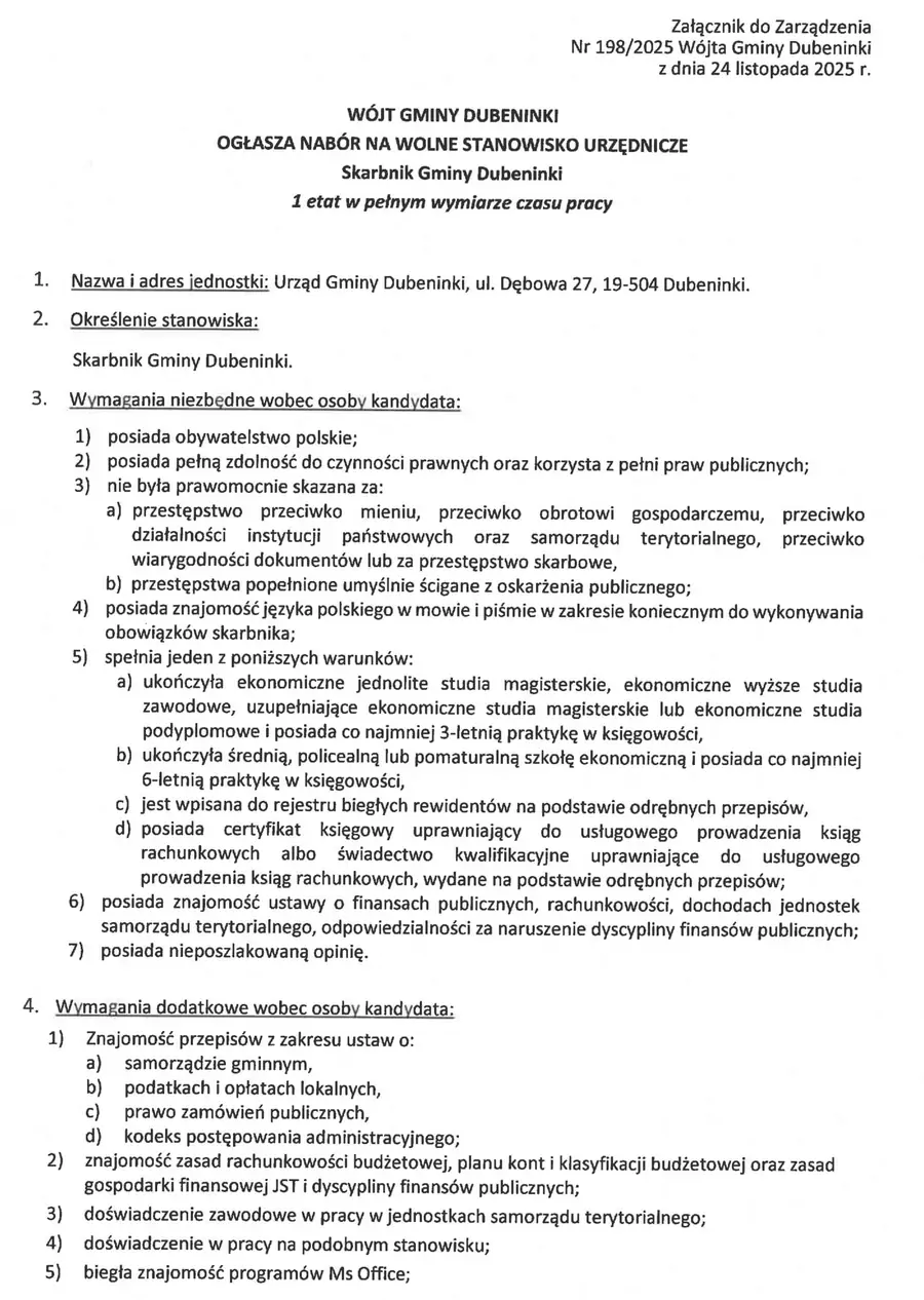 Zarządzenie w tej sparwie dostepne jest w Biuletynie Informajci Publicznej pod adresem https://bip.dubeninki.pl/wakaty/7/50/Skarbnik_Gminy_Dubeninki/