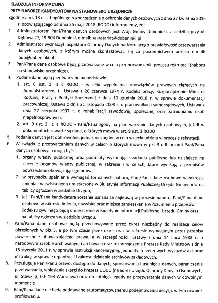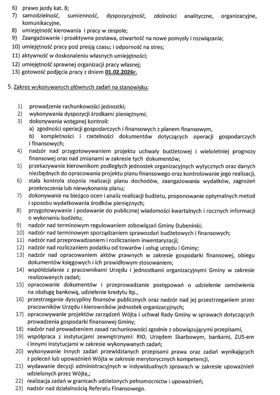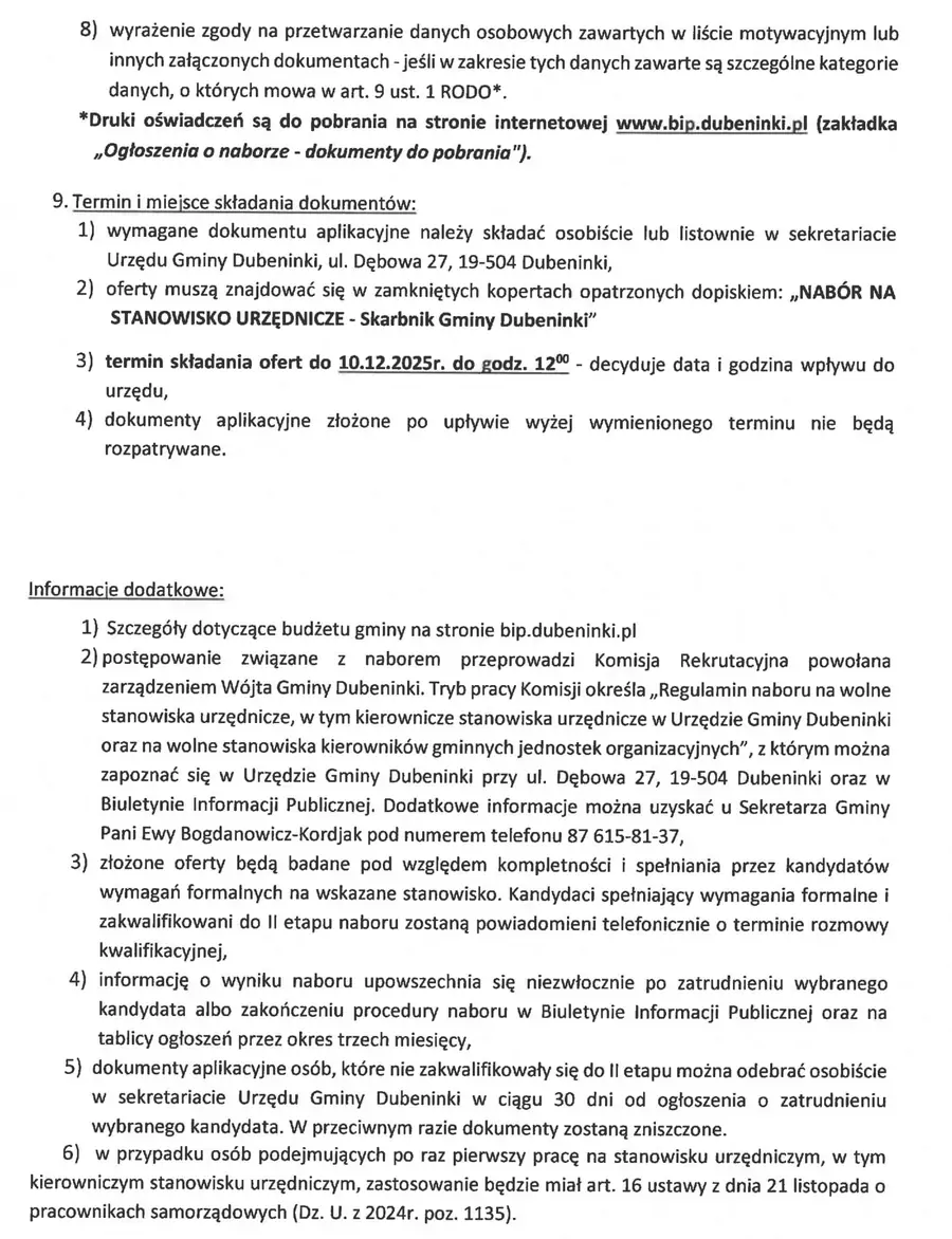 Zarządzenie w tej sparwie dostepne jest w Biuletynie Informajci Publicznej pod adresem https://bip.dubeninki.pl/wakaty/7/50/Skarbnik_Gminy_Dubeninki/