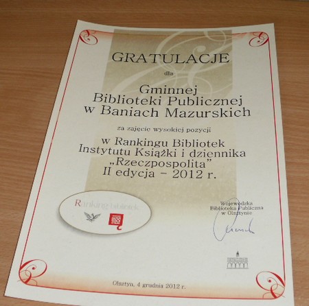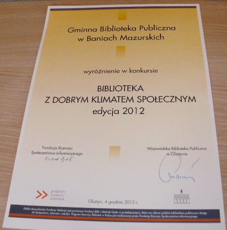 4 grudnia pracownicy Gminnej Biblioteki Publicznej w Baniach Mazurskich uczestniczyli w konferencji regionalnej w Olsztynie, podczas której został rozstrzygnięty konkurs wojewódzki pod hasłem "Biblioteka z dobrym klimatem społecznym". W czasie uroczystości wręczono nagrody dla zwycięskich bibliotek, w tym dla Gminnej Biblioteki Publicznej w Baniach Mazurskich.