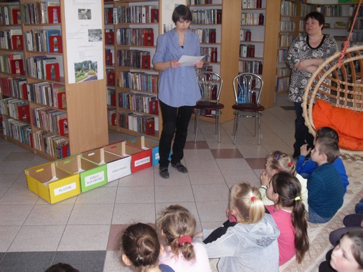 BANIE MAZ. 13 marca w Gminnej Bibliotece Publicznej odbyły się zajęcia edukacyjne dla dzieci ze świetlicy poświęcone ekologii. Tematyka dotyczyła bezpośrednich zagrożeń trzech obszarów środowiska naturalnego: wody, ziemi i powietrza. Dzieci z klasy II i III zapoznały się z przyczynami i skutkami zanieczyszczeń oraz dowiedziały się , w jaki sposób przeciwdziałać negatywnym zjawiskom występującym w przyrodzie. Podczas zajęć uczniowie odpowiadali , w jaki sposób chronić przyrodę i zapobiegać jej zanieczyszczeniu. Przy okazji zdobyli ogromną dawkę wiedzy na temat segregacji odpadów z naszego środowiska, co zostało potwierdzone podczas ćwiczenia praktycznego. Był wywiad przeprowadzony z panią minister - Lucyną Zieloną pt. „Ach, te śmieci!" oraz ogólny quiz przyrodniczy. Ogółem w zajęciach uczestniczyło 23 uczniów.