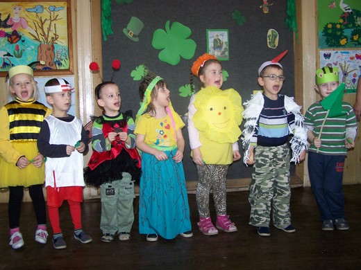 Następnie krótki repertuar wiosenny zaprezentowały dzieci z punktu przedszkolnego oraz uczniowie klas 0-III. Wierszem, piosenką, ciekawym przebraniem i zielonym kolorem garderoby próbowały udowodnić wszystkim zebranym, że wiosna jeśli jeszcze nie dotarła, to jest już naprawdę blisko.