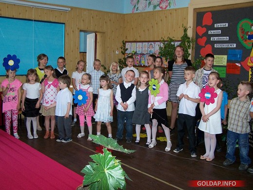 Dzieci z punktu przedszkolnego uczciły ten wyjątkowy dzień przygotowując dla swoich mam program artystyczny oparty na baśni „Czerwony Kapturek". Bajkowa scenografia i kostiumy oraz wspaniała gra naszych najmłodszych zostały nagrodzone gromkimi brawami. Popisy teatralno-wokalne zaprezentowali również uczniowie z oddziału przedszkolnego oraz klas I-V. Mamy z dumą i ze wzruszeniem słuchały występu swoich pociech, które wierszem i piosenką wyraziły swoje uczucia. Następnie mamusie przyjęły własnoręcznie wykonane przez dzieci upominki, słodkie buziaki oraz płynące prosto z serca najserdeczniejsze życzenia.