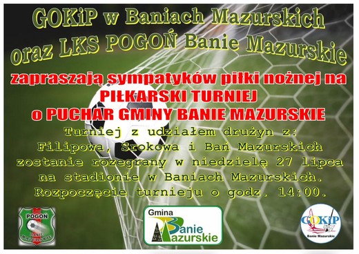 BANIE MAZ. Turniej piłkarski organizują na stadionie gminnym w Baniach Mazurskich miejscowy Gminny Ośrodek Kultury i Promocji oraz LKS Pogoń Banie Mazurskie. Odbędzie się on 27 lipca. Zagrają zespoły z Bań, Srokowa i Filipowa. Początek o godzinie 14.00.