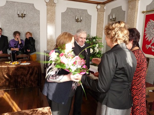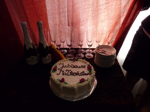 W tej niecodziennej chwili oprócz gratulacji i życzeń zdrowia, pomyślności oraz wspólnej radości bycia razem, wręczono piękne bukiety kwiatów. Nie zabrakło również toastu wzniesionego lampką szampana za zdrowie dostojnych jubilatów i pysznego tortu. Uroczystość przebiegała w szczególnej, niemal rodzinnej atmosferze, przy nastrojowym podkładzie muzycznym i słodkim poczęstunku. Ten wyjątkowy dzień na długo pozostanie w pamięci zarówno jubilatów, jak i przybyłych na tę uroczystość gości. Szanownym jubilatom jeszcze raz życzymy wszystkiego co najlepsze, kolejnych wspólnie spędzonych lat w zdrowiu i spokoju.