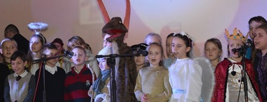 W tym roku korzystając z nastroju bożonarodzeniowego zaprosiliśmy wszystkich do wspólnego kolędowania. W rolę kolędników wcielili się uczniowie, nauczyciele, harcerze oraz zaproszeni goście z różnych zespołów: Zorepad, Nadija, Chór Cerkiewny, Spod Tablicy. W trakcie imprezy odbyły się także aukcje, na których można było wylicytować przeróżne gadżety: zabawki, rower, karmnik, perfumy, czujnik dymu, książki oraz inne rękodzieła, które cieszyły się zainteresowaniem wśród kupujących. Tradycją stała się również loteria fantowa oraz bufet, w którym rodzice serwowali pyszne ciasta, kawę, napoje oraz smaczne kartacze. Czas gościom umilały kolędy, pastorałki i jasełka, a w sercach panowała świąteczna atmosfera. Całość występu dopełniły życzenia noworoczne oraz podziękowania dyrektora organizatorom tak szczytnego przedsięwzięcia, z którego zyski zostaną przekazane na zakup sprzętu muzycznego.