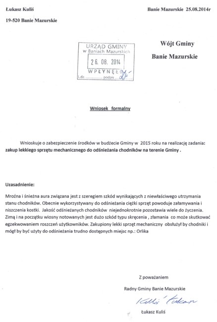 W sierpniu 2014 roku ówczesny radny Łukasz Kuliś złożył wniosek o zakup lekkiego sprzętu do odśnieżania chodników. Wniosek ten nie został wówczas zrealizowany. Sytuacja zmieniła się, gdy włodarz został wójtem. Do małego ciągniczka, który latem jest używany do koszenia trawy, gmina zakupiła pług śnieżny i łańcuchy na koła. Pierwsze testy po ostatnich opadach śniegu wskazują, że maszyna spisuje się doskonale przy odśnieżaniu chodników.