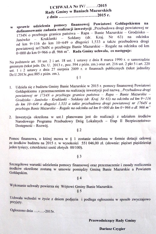 Komisje rady gminy Banie Mazurskie pozytywnie zaopiniowały w ubiegłym tygodniu uchwałę dotyczącą przekazania powiatowi gołdapskiemu 551.046 złotych na realizację inwestycji. Ma ona zostać podjęta w najbliższy piątek na sesji. Tego samego dnia ma zostać podpisane porozumienie w tej sprawie między gminą i powiatem.