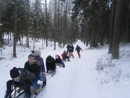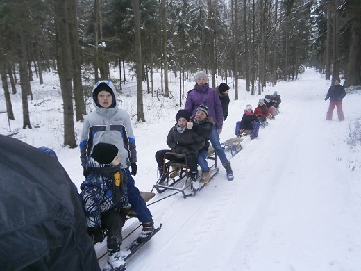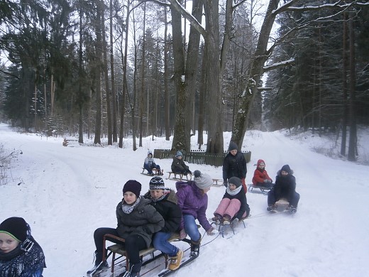 Na koniec szkolnych ferii wszyscy udali się na zorganizowany przez rodziców kulig. Pogoda dopisała, śniegu spadło sporo, więc sanna trwała długo. Zarówno dzieci, jak i dorośli czuli się doskonale podczas podziwiania zimowych krajobrazów i w trakcie zabaw na śniegu. Po powrocie z przejażdżki chętni zebrali się wokół ogniska, przy którym można było posilić się własnoręcznie upieczoną kiełbaską.