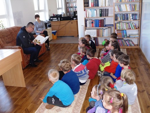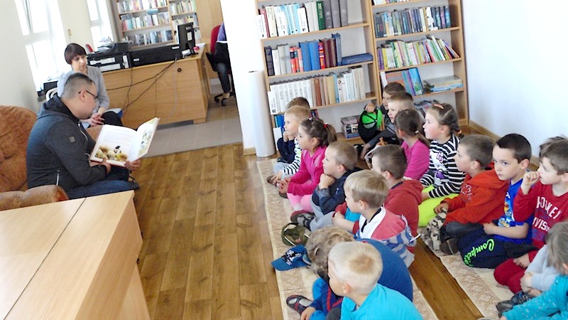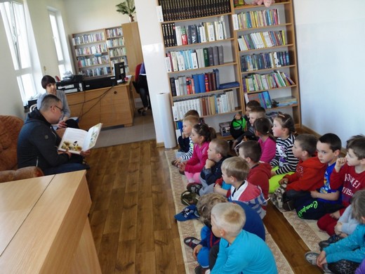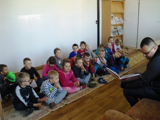 BANIE MAZ. 5 maja w Gminnej Bibliotece Publicznej w Baniach Mazurskich odbyło się kolejne spotkanie w ramach akcji „Cała Polska czyta dzieciom". Gościem był Tomasz Kardel – nauczyciel muzyki i plastyki w Zespole Placówek Oświatowych w Baniach Mazurskich, który przeczytał dwie bajki: „Wieśniak, wąż i lis" oraz „Trzy życzenia". Na spotkanie przyszła klasa 0 wraz z wychowawczynią Haliną Tałejszys.