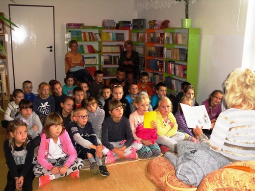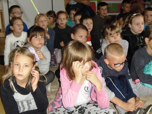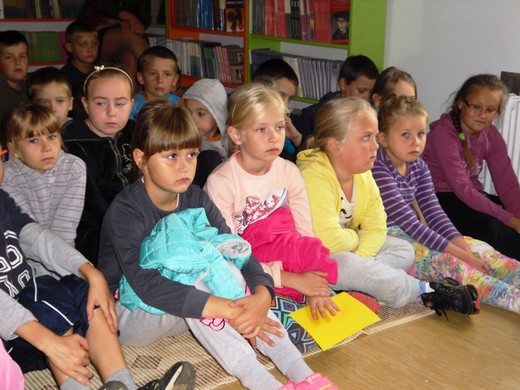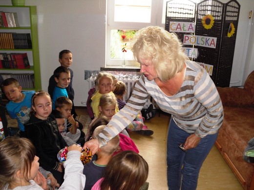 Pani Jadwiga wystąpiła ze wspaniałym przekazem lektorskim i przeczytała utwór Marii Konopnickiej „Na jagody”. Dzieci z zainteresowaniem słuchały baśni, aktywnie brały udział w dyskusji i chętnie odpowiadały na pytania gościa. Maluchy zostały również zaproszone do udziału w konkursie plastycznym, polegającym na wykonaniu ilustracji do wysłuchanego utworu.