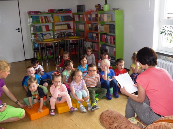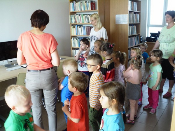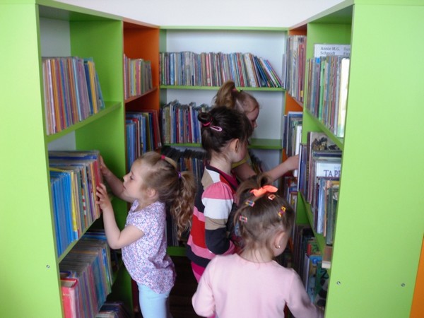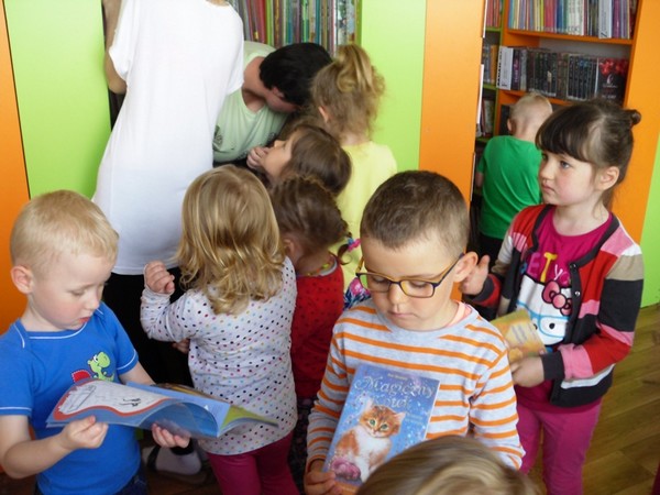 Przedszkolaki z wielkim zainteresowaniem zapoznały się z magicznym miejscem, jakim jest biblioteka. Chętnie wzięły udział w ruchowej interpretacji wiersza „Książeczka” Krystyny Pac-Gajewskiej. Podczas rozwiązywania zagadek dowiedziały się, jaka jest różnica między biblioteką a księgarnią. Dzieci z zaciekawieniem zwiedziły biblioteczne pomieszczenia i chętnie odpowiadały na pytania: po co przychodzimy do biblioteki? jak należy szanować książki? Wielką frajdą była możliwość wypożyczenia wybranej przez siebie książeczki, do której maluszki włożyły piękne, samodzielnie wykonane zakładki.
