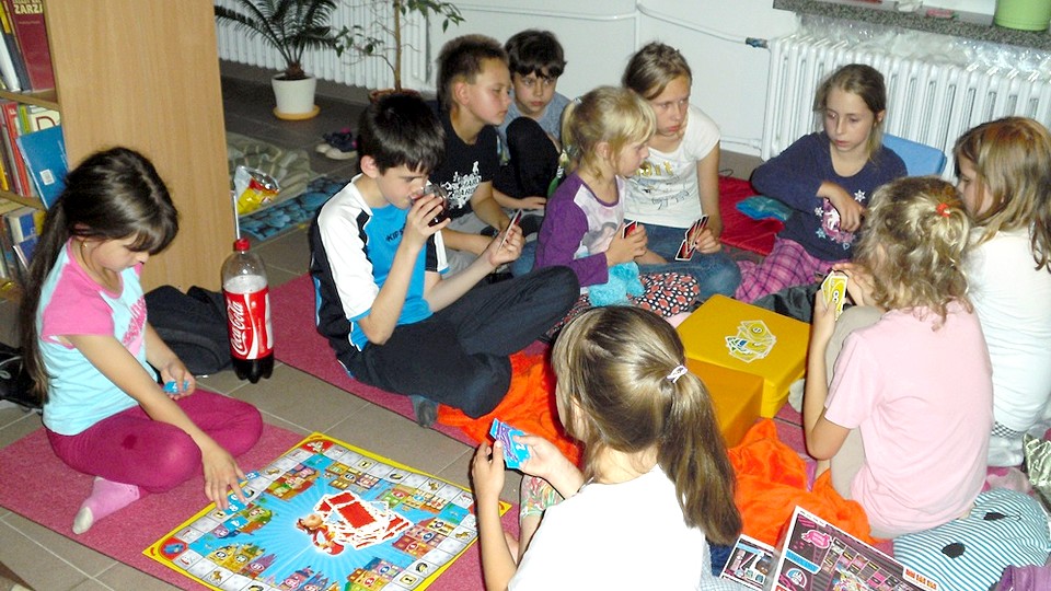 Spotkanie rozpoczęło się o godzinie 19.00 wspólnym czytaniem bajek dla najmłodszych. Następnie dzieci zagrały w „Wisielca” – grę towarzyską polegającą na odgadywaniu słów. Zabawa ta przyniosła uczestnikom wiele frajdy i tak im się spodobała, że nie mieli ochoty jej przerywać. Z kolei bieganie w tunelu animacyjnym - choć było bardzo wyczerpujące - wywołało uśmiech na twarzyczkach maluszków. Kolejną atrakcją była możliwość zagrania w gry planszowe, które tym razem na nockę przyniosły ze sobą dzieci. Wszyscy bardzo przeżywali swoje wzloty i upadki podczas toczonych rozgrywek. Dopiero burczące brzuchy i zapach pizzy od pana Karola z miejscowej piekarni zmusiły dzieci do zakończenia zabaw. Po zapadnięciu zmroku odbył się seans filmowy, który trwał do białego rana. Oglądano „Wielką Szóstkę”, „Angry Birds” i „Madagaskar 3”. O 5.30, po nocy pełnej wrażeń, uczestnicy położyli się spać. Dużym wyzwaniem dla rodziców było wyrwanie dzieciaczków z objęć Morfeusza i zobaczenie ich w tym trudnym dla nich momencie.