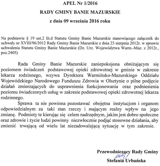 W sprawie tej w lipcu 2015r. wójt spotkał się z dyrektorem oddziału NFZ w Olsztynie, a następnie z prezesem Warmińsko-Mazurskiej Izby Lekarskiej. W związku z nieustającymi informacjami napływającymi od mieszkańców, 9 września 2016 roku rada gminy Banie Mazurskie przyjęła apel o pilne podjęcie działań zmierzających do usprawnienia funkcjonowania oraz podniesienia poziomu świadczonych usług w zakresie podstawowej opieki zdrowotnej lekarza rodzinnego.