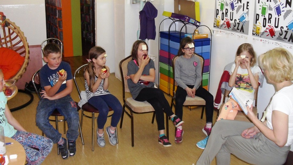 Spotkanie pod hasłem "Czytanie porusza" rozpoczęliśmy o godz. 19.00 od zabawy w kalambury. Następnym punktem spotkania były podchody w bibliotece, które przyniosły wielką frajdę dla dzieci, gdy na półkach między książkami szukały słodkich niespodzianek. W chwili przerwy przeczytaliśmy dzieciom mrożący krew w żyłach thriller dla dzieci Grzegorza Kasdepke pt. "Kto zamawiał koszmarną przygodę". Dla rozwinięcia wyobraźni zorganizowaliśmy dla dzieci zabawę we wspólne układanie historii. Tworzona przez dzieci nie miała końca. W późnych godzinach nocnych w związku z udziałem w akcji Noc Bibliotek wyemitowaliśmy film "Biuro detektywistyczne Lassego i Mai: Stella Nostra", który oglądaliśmy aż do przybycia rodziców.