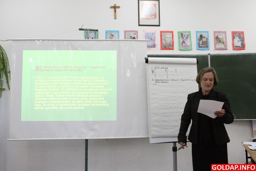 Spotkanie poprowadziły pracownice Poradni Terapii Uzależnienia od Alkoholu, Narkotyków i Współuzależnienia w Olecku. O problemach związanych z alkoholem opowiedziała Danuta Klejmont. Jak stwierdziła, nikt, kto spożywa alkohol, nie jest bezpieczny. Myślenie, że ma się mocną głowę jest zwykle złudne. Przedstawiła też dość szczegółowo proces popadania w chorobę alkoholową. Jak się okazuje, problem ten dotyczy wszystkich, ale nie wszystkich jednakowo.