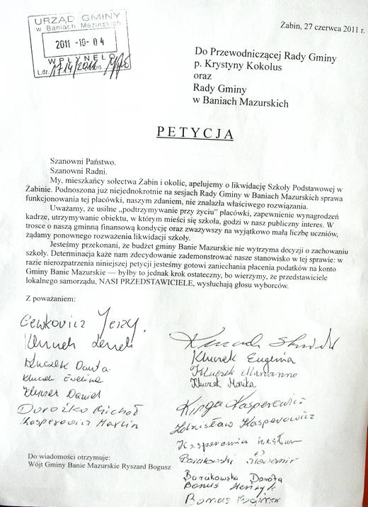 Jesteśmy przekonani, że budżet gminy Banie Mazurskie nie wytrzyma decyzji o zachowaniu szkoły. Determinacja każe nam zdecydowanie zademonstrować nasze stanowisko w tej sprawie. W razie nierozpatrzenia niniejszej petycji jesteśmy gotowi zaniechania płacenia podatków na konto gminy Banie Mazurskie - można przeczytać apelu, pod którym podpisało się 18 mieszkańców sołectwa Żabin i okolic.