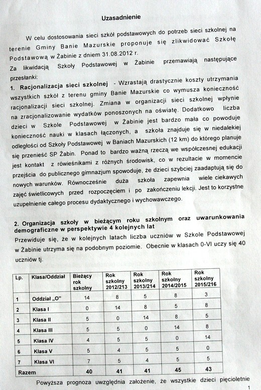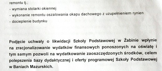 Głównym powodem takiej decyzji jest czynnik ekonomiczny. Utrzymanie szkoły w Żabinie kosztowało w roku 2011 639.390,15zł, zaś w Lisach 546.742.39zł. W przeliczeniu na ucznia daje to kwoty odpowiednio 23.910,60zł i 15.719,63zł. Dla porównania utrzymanie ucznia w ZPO w Baniach Mazurskich kosztowało 5.239,44zł.