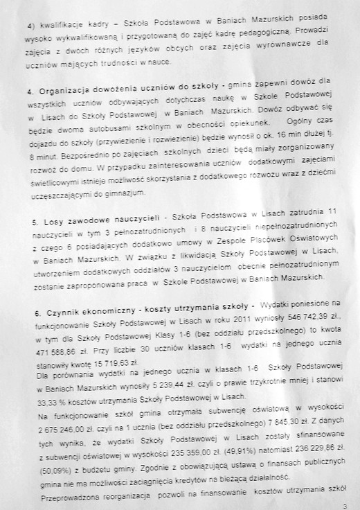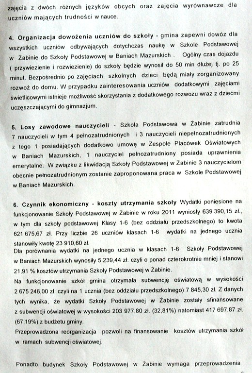 Według wyliczeń urzędników subwencja oświatowa otrzymana przez gminę pokryła 32,81% wydatków poniesionych na funkcjonowanie szkoły w Żabinie oraz 49,91% w przypadku szkoły w Lisach. Pozostałe środki pochodził z budżetu gminy.