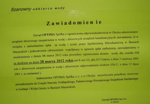 Teraz członków Spółdzielni Mieszkaniowej czeka kolejna „niespodzianka". Niewykluczone, że wkrótce nie będą mieli bieżącej wody. Ograniczenia w jej dostawie zapowiedziała już firma Optima. Wszystko dlatego, że - jak można przeczytać na ogłoszeniach w blokach - SM nie reguluje rachunków i jednostronnie odrzuciła współpracę w zakresie spłaty zadłużenia.