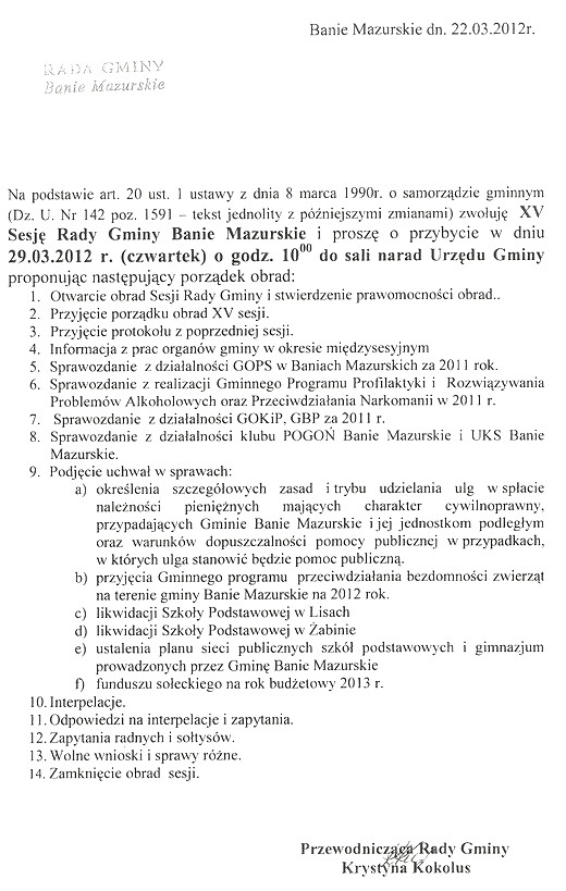 29 marca w sali narad w Urzędzie Gminy Banie Mazurskie odbędzie się XV sesja Rady Gminy. W czasie obrad, które rozpoczną się o godzinie 10.00, radni zajmą się m.in. uchwałami dotyczącymi likwidacji szkół w Żabinie i Lisach.