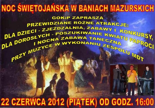 Rokrocznie, w piątek przypadający najbliżej daty 24 czerwca, Gminny Ośrodek Kultury i Promocji w Baniach Mazurskich organizuje na stadionie gminnym (przed sceną) imprezę plenerową pn. „Noc Świętojańską". W tym roku impreza ta, na którą serdecznie zapraszamy, odbędzie się w najbliższy piątek - 22 czerwca. We wczesnych godzinach popołudniowych planujemy zorganizować czas dla młodszych uczestników imprezy. Zapowiedział swój przyjazd wystawca "dmuchańców" (zjeżdżalnia itp.), a ośrodek kultury będzie starał się umilić czas najmłodszym muzyką i okolicznościowymi konkursami.