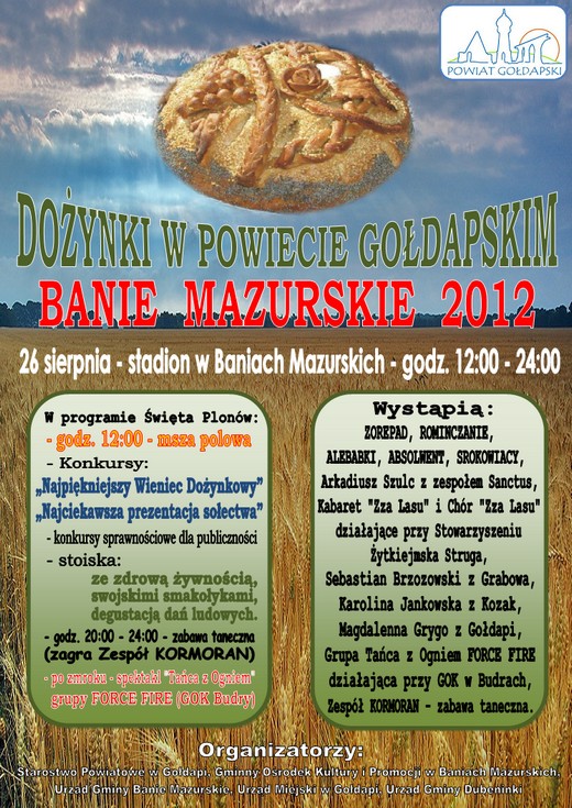 W najbliższą niedzielę (26/08) na stadionie w Baniach Mazurskich odbędą się tegoroczne dożynki powiatowe. Rozpoczną się o godzinie 12.00 i potrwają do północy. W programie m.in. msza święta polowa i konkursy na najpiękniejszy wieniec dożynkowy oraz najciekawszą prezentację sołectwa. Wieczorem odbędzie się zabawa taneczna z zespołem Kormoran. Szczegóły na plakacie.