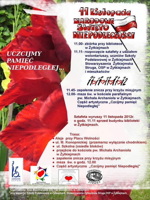 Sztafeta 11.11.11.11.12,zapalenie znicza przy krzyżu misyjnym, a następnie msza święta oraz przedstawienie pt. „Czcimy pamięć Niepodległej" - tak będą jutro wyglądały obchody Święta Niepodległości w Żytkiejmach. Szczegóły na plakacie.