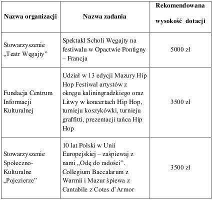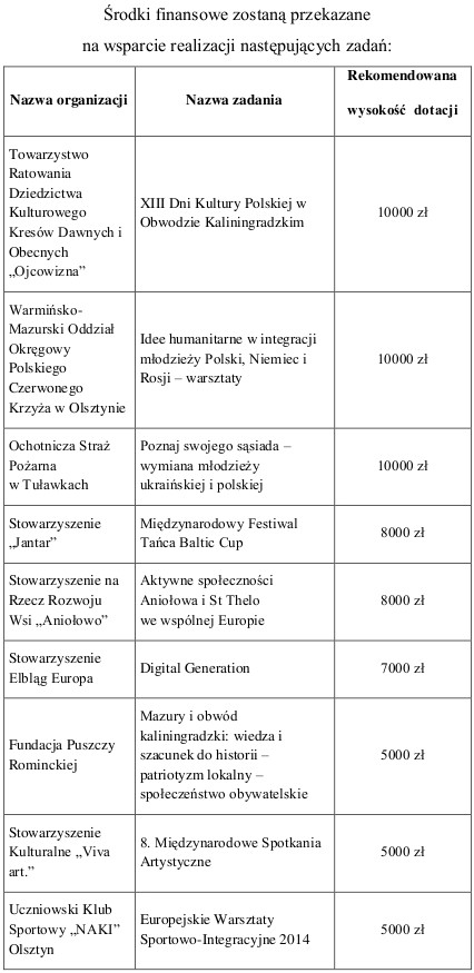Fundusze samorządu województwa warmińsko-mazurskiego pomogą m.in. Towarzystwu Ratowania Dziedzictwa Kulturowego Kresów Dawnych i Obecnych „Ojcowizna" z Węgorzewa w organizacji XIII edycji Dni Kultury Polskiej w obwodzie kaliningradzkim oraz Ochotniczej Straży Pożarnej w Tuławkach w realizacji projektu wymiany młodzieży ukraińskiej i polskiej. Dofinansowanie otrzymają także elbląskie Stowarzyszenie „Jantar" na realizację kolejnej edycji Międzynarodowego Festiwalu Tańca Baltic Cup oraz Warmińsko-Mazurski Oddział Okręgowy Polskiego Czerwonego Krzyża w Olsztynie na przeprowadzenie warsztatów pt. „Idee humanitarne w integracji młodzieży Polski, Niemiec i Rosji".