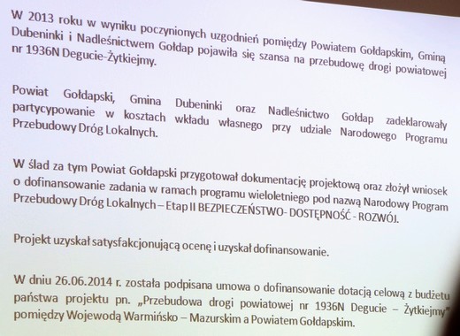 ŻYTKIEJMY. 12 grudnia oficjalnie do użytku oddana została zmodernizowana droga powiatowa Zytkiejmy-Degucie. Jej przebudowa kosztowała 1,72mln złotych. 860 tysięcy pochodziło z Narodowego programu przebudowy dróg lokalnych, 660 tysięcy z budżetu powiatu, 100 tysięcy z budżetu gminy Dubeninki i 100 tysięcy z budżetu Lasów Państwowych. W uroczystym przecięciu wstęgi w Żytkiejmach wzięli udział m.in. byli o obecni radni powiatowi, byli i obecni radni rady gminy w Dubeninkach, sołtysi i mieszkańcy gminy, a także wykonawcy robót.