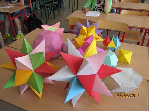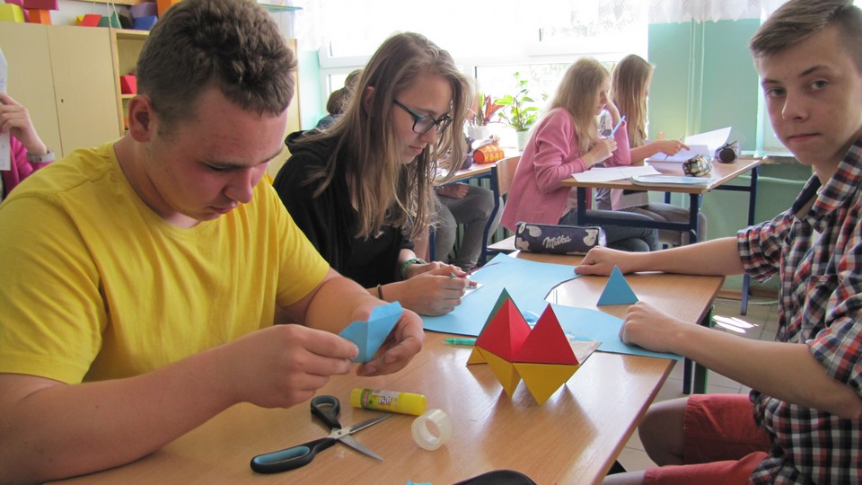 DUBENINKI. Kolejny raz po egzaminach gimnazjalnych uczniowie klasy trzeciej Gimnazjum w Dubeninkach mając trochę wolnego czasu na lekcjach matematyki wykonywali bardzo ciekawe modele brył geometrycznych. Pomysłów na bryły było mnóstwo. Na początek uczniowie poznali pojęcie brył platońskich. Okazało się, że wielościany foremne to nie tylko sześcian i czworościan foremny. Szukali w internecie ciekawych siatek. Zastanawiali się, czy na pewno wystarczy „zakładek” na właściwe sklejenie brył. Żeby siatki były dokładnie wykonane przypomnieć musieli konstrukcję wielokątów foremnych. Sześciokąt foremny to coś, co konstruowali od „zawsze”. Ci, którzy, którzy zdecydowali sie robić dwunastościany foremne musieli przypomnieć sobie konstrukcję pięciokąta foremnego. Bardzo ważne jest to, że zgodnie z podstawą programową dla trzeciego etapu edukacyjnego uczniowie umiejętnie pracowali zespołowo. Sami dobierali się w trzy- lub czteroosobowe zespoły, wspólnie szukali modeli, które chcieli skonstruować. Kilka zespołów tworzyło modele wielościanów gwiaździstych. I tak oto na lekcjach matematyki gimnazjaliści stworzyli już bardzo ciekawe modele graniastosłupów pochyłych, dwunastościanów i dwudziestościanów foremnych, wielościanów gwiaździstych i inne. Na podsumowanie uczniowie wspólnie z nauczycielem matematyki ocenili wykonane modele. Niezależnie od niewielkich niedociągnięć wszyscy mogą je oglądać, a naprawdę jest co podziwiać!