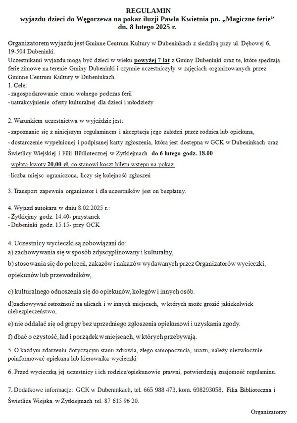 Zaproszenie do udziału w nim mają dzieci w wieku powyżej 7 lat z gminy Dubeninki oraz te, które spędzają ferie zimowe na terenie gminy i czynnie uczestniczyły w zajęciach organizowanych przez GCK. Koszt udziału w wyjeździe to 20 złotych. Pieniądze te zostaną przeznaczone na zakup biletu wstępu na pokaz.