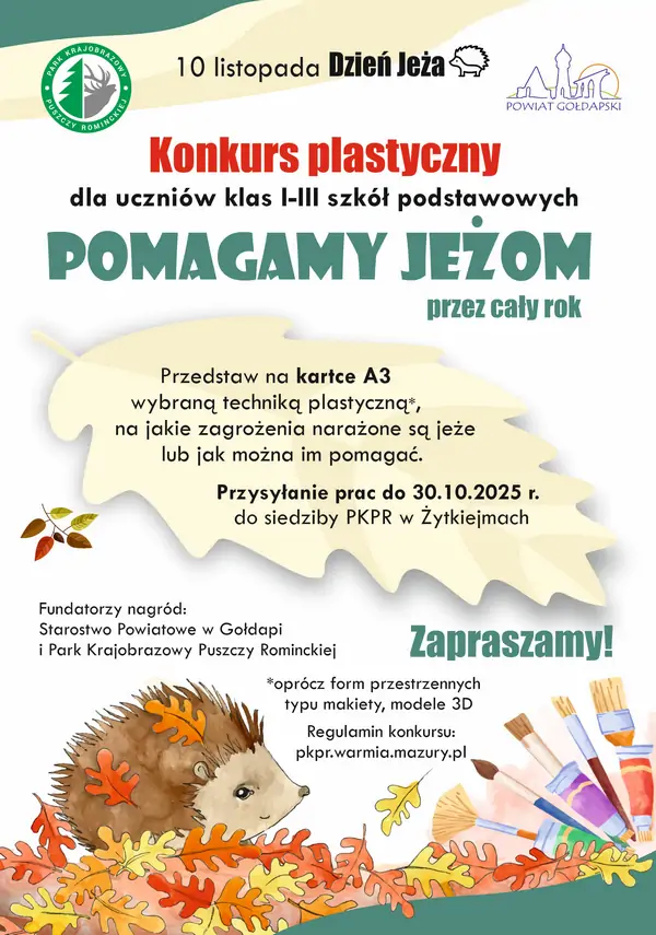 Park Krajobrazowy Puszczy Rominckiej zaprasza uczniów klas 1-3 szkół podstawowych z terenu powiatu gołdapskiego do udziału w konkursie plastycznym pt. "Pomagamy jeżom przez cały rok".