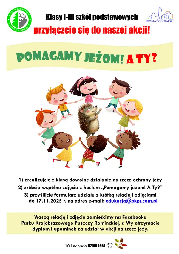 Park Krajobrazowy Puszczy Rominckiej serdecznie zaprasza klasy 1-3 ze szkół podstawowych do udziału w akcji „Pomagamy jeżom! A Ty?”.