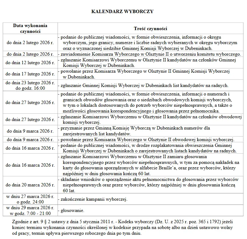 Czas na zawiadomienie komisarza wyborczego o utworzeniu komitetów wyborczych jest do 2 lutego. Zarejestrowane komitety będą miały czas na zgłoszenie Gminnej Komisji Wyborczej w Dubeninkach kandydatów na radnych do 23 lutego do godziny 16:00. Głosowanie zaplanowano 29 marca. Gdyby zgłosił się tylko jeden komitety i jeden kandydat, zostanie on wówczas radnym bez przeprowadzania głosowania.