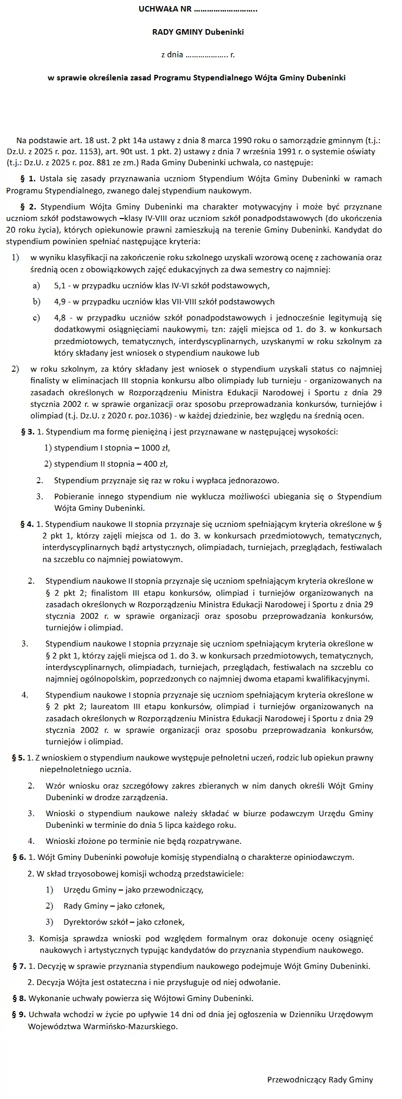 Wójt gminy Łukasz Balczun przedstawianie projektu uchwały rozpoczął od zgłoszenia autopoprawek. Pierwsza dotyczyła tytułu programu. Pierwotnie miał on brzmieć Program Stypendialny Wójta Gminy Dubeninki, Łukasz Balczun jednak zdecydował się usunąć słowo „wójta”. Kolejną istotną modyfikacją było obniżenie wymaganego progu oceny za zachowanie z "wzorowej" na "co najmniej bardzo dobre". Zmiana ta ma na celu poszerzenie grona potencjalnych stypendystów, dając szansę większej liczbie uczniów na otrzymanie wsparcia finansowego.