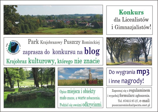 1 października pod hasłem „Krajobraz kulturowy, którego nie znacie" rusza konkurs na prowadzenie bloga. Jego organizatorem jest Park Krajobrazowy Puszczy Rominckiej. Konkurs adresowany jest do uczniów szkół gimnazjalnych i ponadgimnazjalnych. Swój udział należy zgłosić poprzez dostarczenie do parku wypełnionego formularza zgłoszenia w terminie do 7 dni od założenia bloga. Szczegółowy regulamin dostępny jest u organizatora (e-mail: puszczaromincka@poczta.onet.pl). Do wygrania są: odtwarzacz mp3, pendrive'y, akcesoria komputerowe i publikacje książkowe. Serdecznie zapraszamy do udziału.