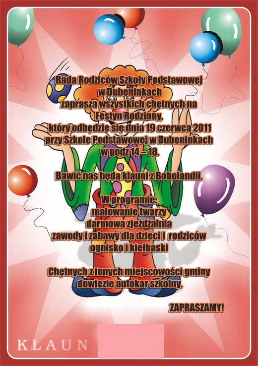 Rada Rodziców Szkoły Podstawowej w Dubeninkach zaprasza wszystkich chętnych na Festyn Rodzinny. Odbędzie się on 19 czerwca przy szkole. Początek zabawy o godzinie 14.00. W programie imprezy m.in. zawody i zabawy dla dzieci oraz rodziców, darmowa zjeżdżalnia, malowanie twarzy.