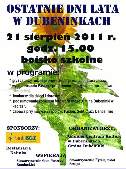 Pasjon, Selit, Crazy Dance, Trio - przy muzyce tych zespołów będzie się można pobawić w najbliższą niedzielę w Dubeninkach podczas festynu pn. „Ostatnie dni lata". Impreza odbędzie się na szkolnym boisku, początek o godzinie 15.00. Więcej informacji na plakacie.