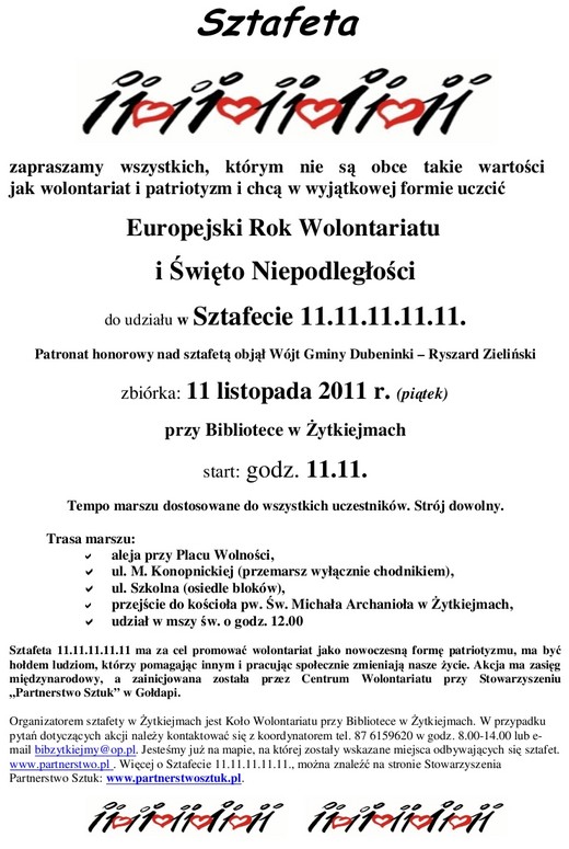 Zapraszamy wszystkich, którym nie są obce takie wartości jak wolontariat i patriotyzm i chcą w wyjątkowej formie uczcić Europejski Rok Wolontariatu oraz Święto Niepodległości, do udziału w Sztafecie 11.11.11.11.11 w Żytkiejmach. Patronat honorowy nad nią objął wójt gminy Dubeninki Ryszard Zieliński.
