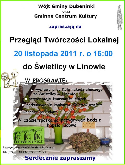 Wójt gminy Dubeninki oraz Gminne Centrum Kultury zapraszają na Przegląd Twórczości Lokalnej. Odbędzie się on 20 listopada w świetlicy wiejskiej w Linowie, początek o godzinie 16.00. W programie m.in. prezentacja lokalnych twórców, karaoke i podsumowanie konkursu „Chlebek wiejski".