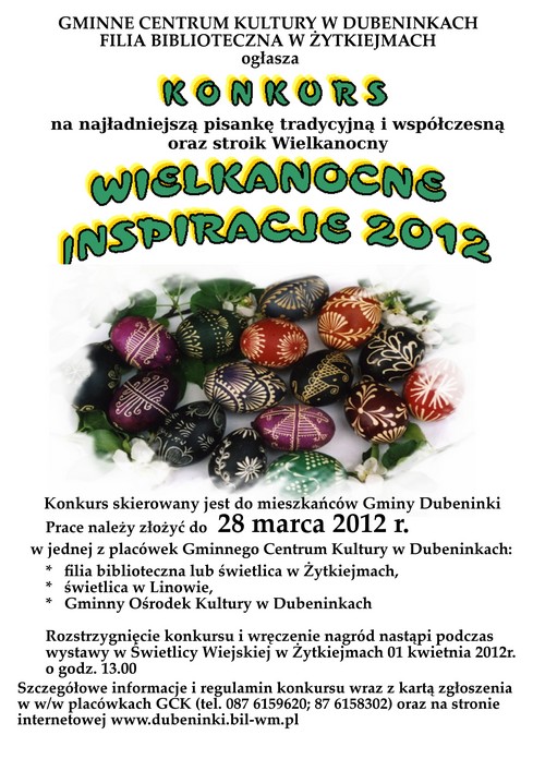 Gminne Centrum Kultury w Dubeninkach - Filia Biblioteczna w Żytkiemach zaprasza do udziału w konkursie na najładniejszą pisankę tradycyjną i współczesną oraz stroik wielkanocny. Prace należy składać do 28 marca. Rozstrzygniecie konkursu 1 kwietnia. Szczegóły w regulaminie i na plakacie.