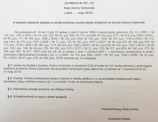 Od czerwca mieszkańcy gminy Dubeninki korzystający z wody dostarczanej przez spółkę Optima zapłacą za nią o kilka procent więcej. Radni gminny przyjęli dziś cennik przedłożony przez dostawcę oraz ustalili wysokość dopłaty do metra sześciennego wody w budżetu gminnego.