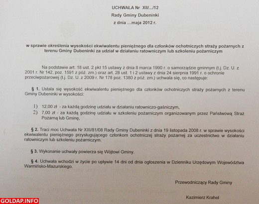 Strażacy-ochotnicy z gminy Dubeninki za każdą godzinę udziału w akcji ratowniczo-gaśniczej otrzymują 12 złotych za godzinę. Za udział w szkoleniu pożarniczym organizowanym przez PSP lub gminę dostają 7 złotych. Choć stawki te obowiązują już od dwóch lat to dopiero w poniedziałek przyjęta została odpowiednia uchwała Rady Gminy w tej sprawie.