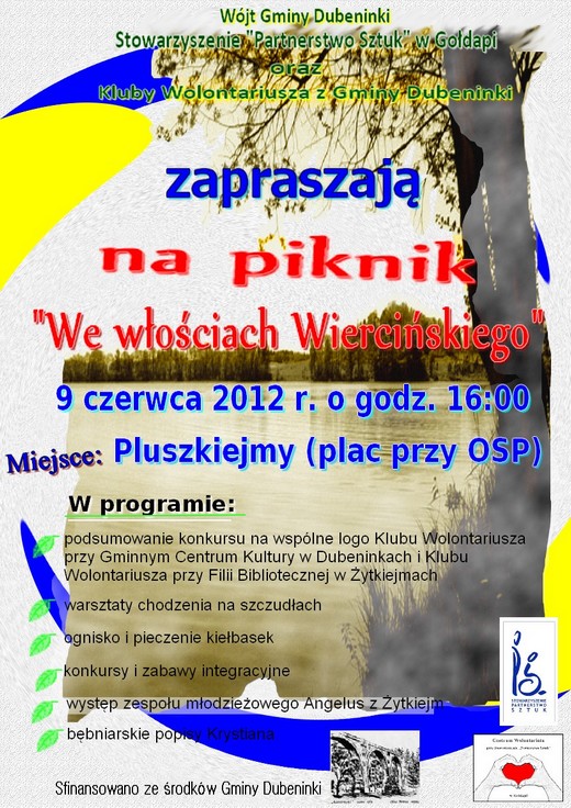 9 czerwca w Pluszkiejmach podjedzie się piknik „We włościach Wiercińskiego". W programie m.in. warsztaty chodzenia na szczudłach, ognisko i pieczenie kiełbasek, konkursy i zabawy, rozstrzygniecie konkursu na logo klubów wolontariusza w Dubeninkach i Żytkiejmach. Szczegóły na plakacie.