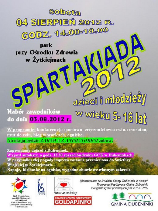 Stowarzyszenie „Partnerstwo Sztuk", Klub Wolontariusza przy Filii Bibliotecznej w Żytkiejmach oraz Klub Wolontariusza przy Gminnym Centrum Kultury w Dubeninkach zapraszają do udziału w Spartakiadzie 2012. Odbędzie się ona 4 sierpnia w parku przy Ośrodku Zdrowia w Żytkiejmach. Uczestnicy podzieleni na cztery grupy wiekowe będą rywalizować w konkurencjach sprawnościowo-zręcznościowych, a zwycięzcy zmierzą się w finale. Zainteresowani chęć uczestnictwa powinni zgłaszać do 3 sierpnia w Filii Bibliotecznej i Świetlicy w Żytkiejmach, Gminnym Centrum Kultury w Dubeninkach lub Świetlicy Wiejskiej w Linowie: osobiście, telefonicznie lub drogą elektroniczną podając imię, nazwisko oraz wiek. Tel. 87-615-96-20, 87-615-83-02, 87-615-85-82; e-mail: bibzytkiejmy@op.pl; klubzyt@o2.pl; gckdubeninki@wp.pl.