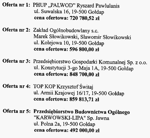 W ogłoszonym przez Urząd Miejski przetargu, złożonych zostało 5 ofert, wszystkie przez gołdapskie firmy.