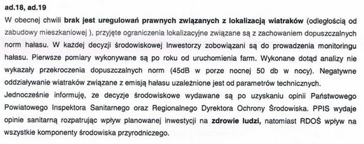 18. Proszę o podanie informacji: czy i jakie gmina podjęła do chwili obecnej działania osłonowe wobec mieszkańców zamieszkałych w sąsiedztwie wiatraków? (chodzi o działania wobec mieszkańców zamieszkałych w promieniu do 8 km od wiatraków):